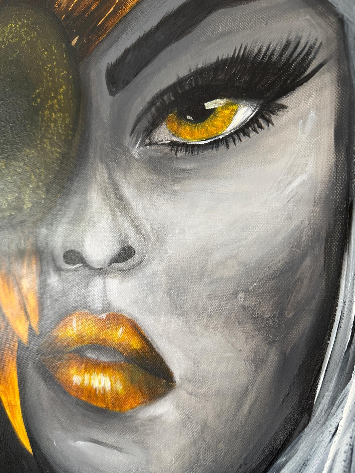 Dieses Werk ist ein Sinnbild für inneres Strahlen und die Entscheidung, sich der Sonne zuzuwenden – selbst in grauen Zeiten. Die Sonnenblume, dominant und leuchtend, verdeckt ein Auge – nicht, um zu verbergen, sondern um den Blick bewusst nach innen zu lenken. Was sie verdeckt, enthüllt sie zugleich: Stärke, Wachstum und Licht, das aus der eigenen Tiefe kommt. Die goldenen Akzente – in Lippen, Auge und Blüte – symbolisieren das, was wir alle in uns tragen: Wert, Kraft und Strahlkraft, die nicht von außen kommen müssen. Wie eine Sonnenblume richtet sich auch die Persönlichkeit in diesem Werk dem Licht zu – selbstbewusst, würdevoll und mit klarer Ausrichtung. „Inner Bloom“ ist mehr als ein Porträt – es ist ein Statement. Eine Einladung, sich selbst zu entfalten.